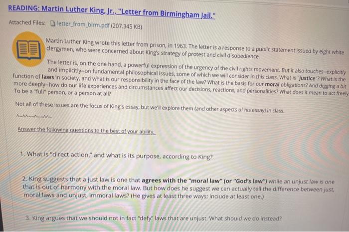 Questions and Answers What are. View Letter from Birmingham Jail - Questions and Answerspdf from SOCIAL STUDIES 101 at Johns Creek High School. Martin Luther Kings Letter from a Birmingham Jail.